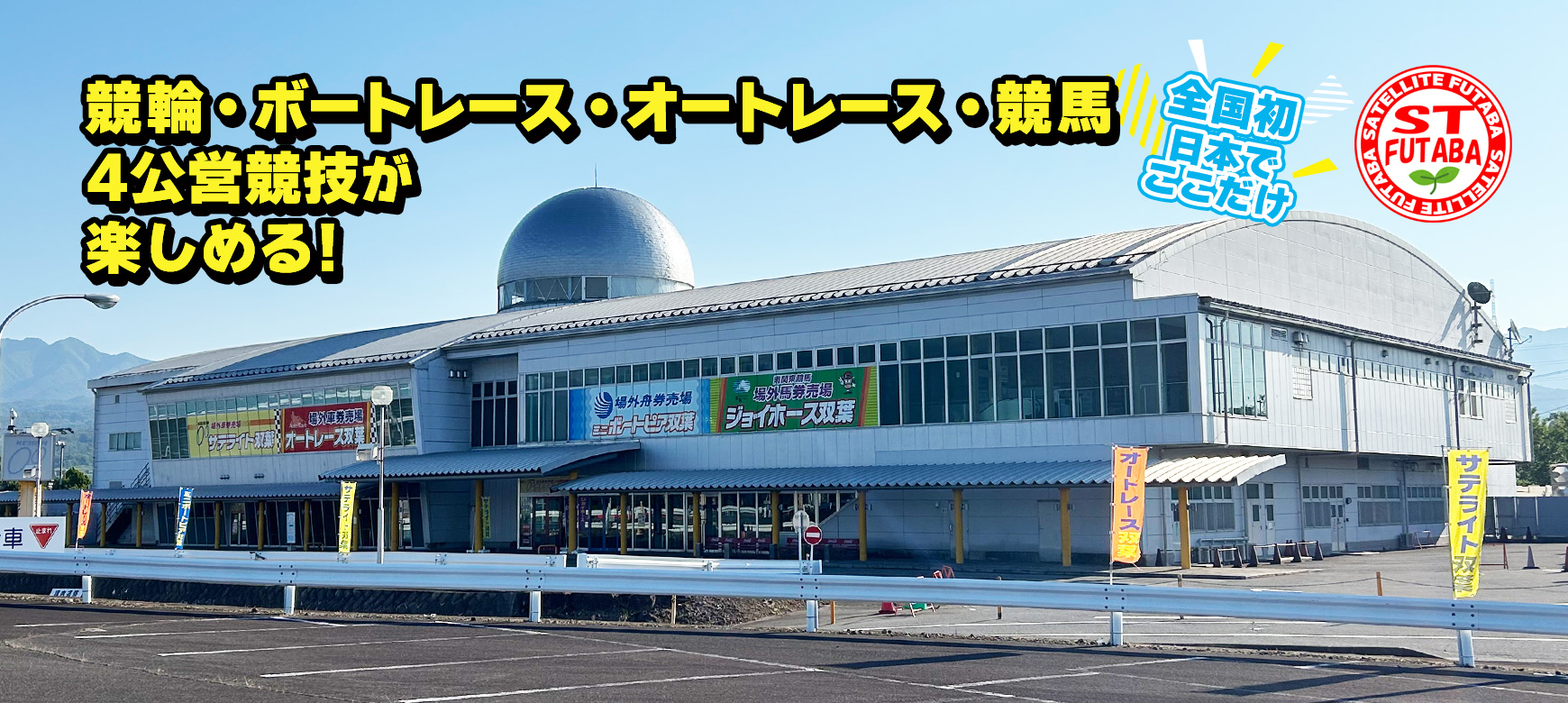 日本でここだけ! 競輪、ボートレース、オートレース、地方競馬が同時に楽しめる日本初の4公営競技併設の場外売り場。 ※複合型場外発売施設 双葉は、サテライト双葉、ボートレースチケットショップ双葉、オートレース双葉、ジョイホース双葉の総称です。 ※DMによるお問合せはご遠慮下さい。