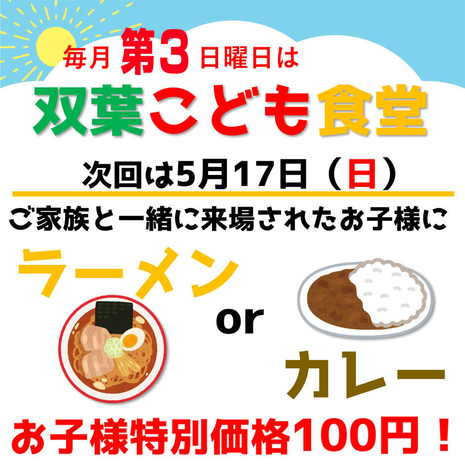 サテライト双葉では毎月第3日曜日にこども食堂を開催しております!次回は、5月17日(日)に開催予定です!ご家族と一緒にご来場されたお子様にラーメンもしくはカレーを、お子様特別価格100円にてご提供いたします!!