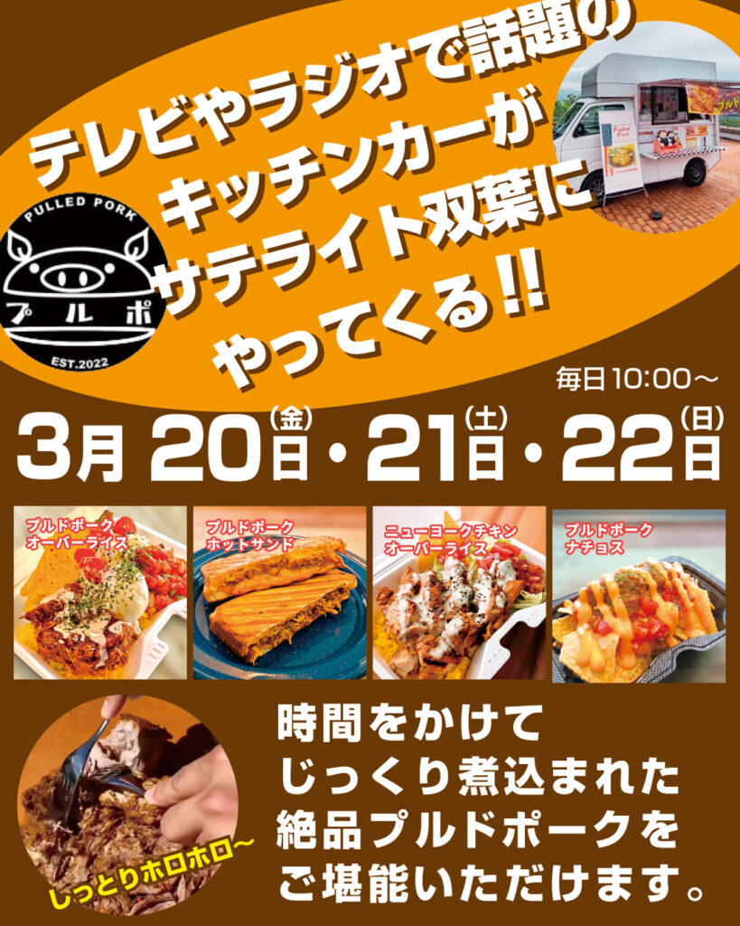 3月20日(金祝)・21日(土)・22日(日)の三日間、人気のプルドポーク専門キッチンカー「プルポ」がサテライト双葉に出店します。