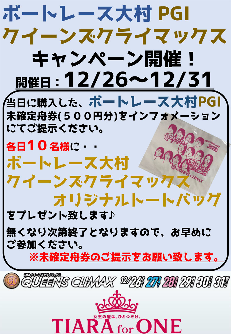 ボートレース大村PG1クイーンズクライマックス開催を記念して、下記期間中、当日に購入したボートレース大村PG1未確定舟券500円分をインフォメーションにご提示いただくと、先着10名様にオリジナルトートバッグをプレゼントします!