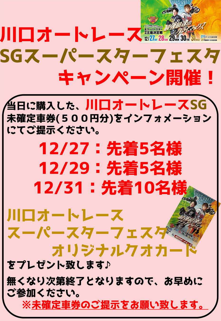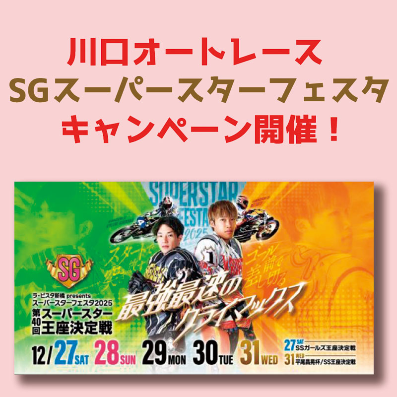 川口オートレースSGスーパースターフェスタ2025開催を記念して、下記開催日の当日に購入した川口オートレースSG未確定車券500円分をインフォメーションにご提示いただくと、先着でオリジナルQUOカードをプレゼントします!
