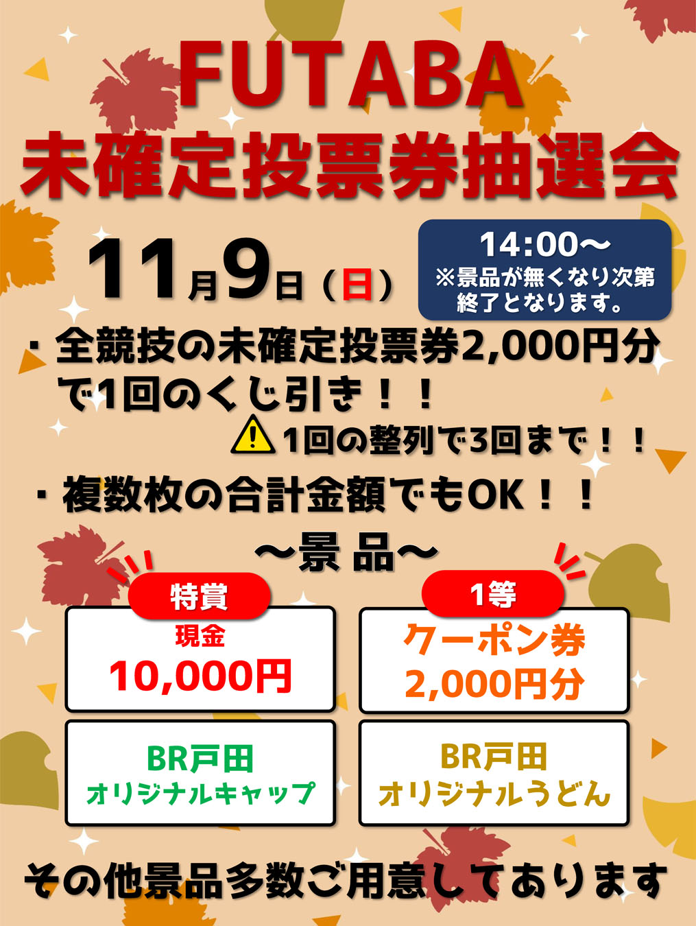 下記日程でFUTABA未確定投票券抽選会を開催します。