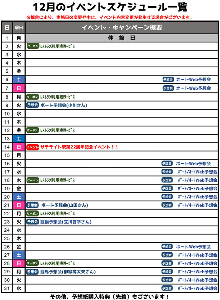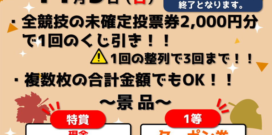 2025.11.26 12月のイベントスケジュール イベント情報 記事のタイトルとURLをコピーする 11月16日(日)限定企画!BR戸田オリジナルQUOカードプレゼント! 前の記事 レストラン利用で競輪・ボートレースが楽しめるクーポンプレゼント♪12月の配布日程 次の記事