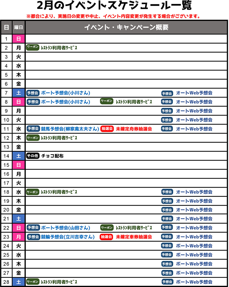 2026.01.29 2026年2月のイベントスケジュール イベント情報 記事のタイトルとURLをコピーする WEB投票で豪華景品が当たる!ボートレースオールスター ファン投票!! 前の記事 レストラン利用で競輪・ボートレースが楽しめるクーポンプレゼント♪2月の配布日程 次の記事