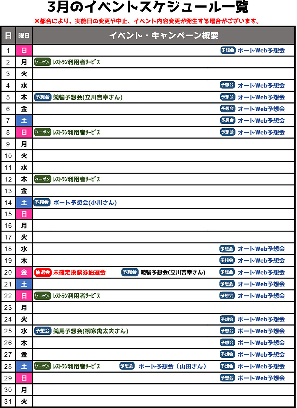 2026.02.26 2026年3月のイベントスケジュール イベント情報 記事のタイトルとURLをコピーする 熊本G1 場外・サテライトキャンペーン THANKS YOU 抽選会開催!! 前の記事 レストラン利用で競輪・ボートレースが楽しめるクーポンプレゼント♪3月の配布日程 次の記事