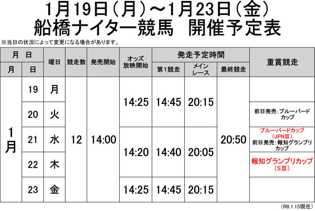 開催スケジュールは天候等の事情により変更することがあります。詳しくは、ご来場いただいた際に当館インフォメーションにてご確認いただくか、当館までお電話(0551-200-200)にてご確認ください。 SCHEDULE開催スケジュール 2026年1月 拡大表示するには、ピンチアウト(2本の指で画面をつまむようにして指の間隔を広くする)操作を行ってください。 2026年2月 拡大表示するには、ピンチアウト(2本の指で画面をつまむようにして指の間隔を広くする)操作を行ってください。 LINK関連リンク 川崎競馬 船橋競馬 南関東4競馬場 東京シティ競馬 地方競馬情報サイト 浦和競馬